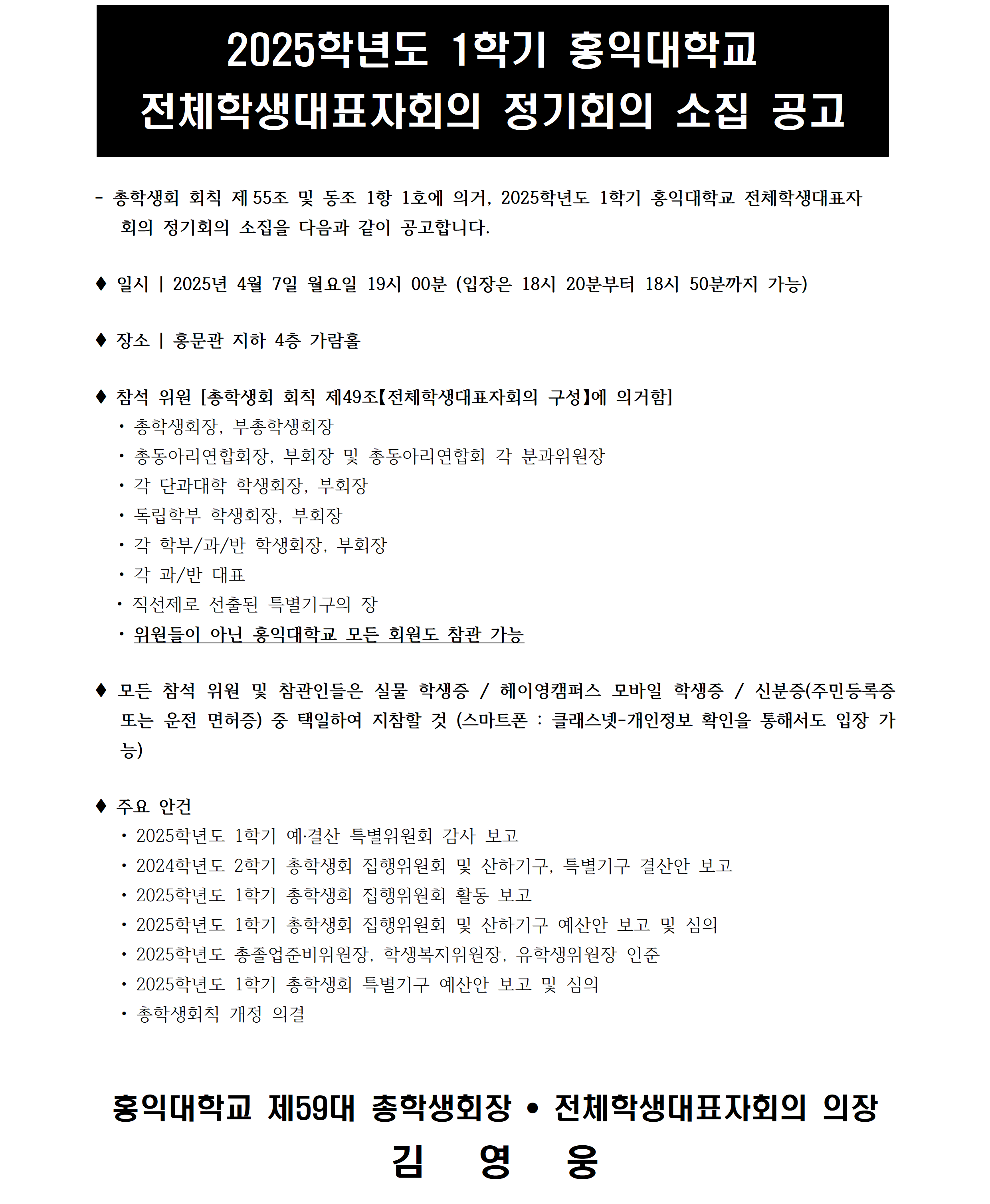 총학생회칙 제55조에 의거하여, 2025학년도 1학기 전체학생대표자회의 정기회의 소집을 공고합니다.