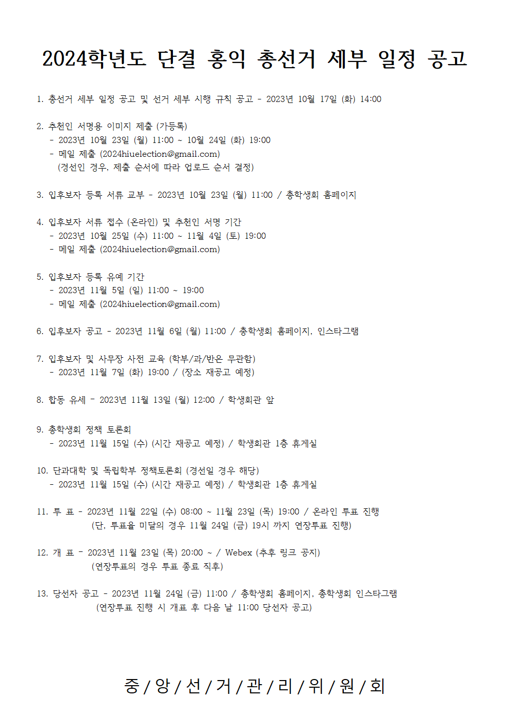 [단결 홍익 총선거 세부 일정 공고]